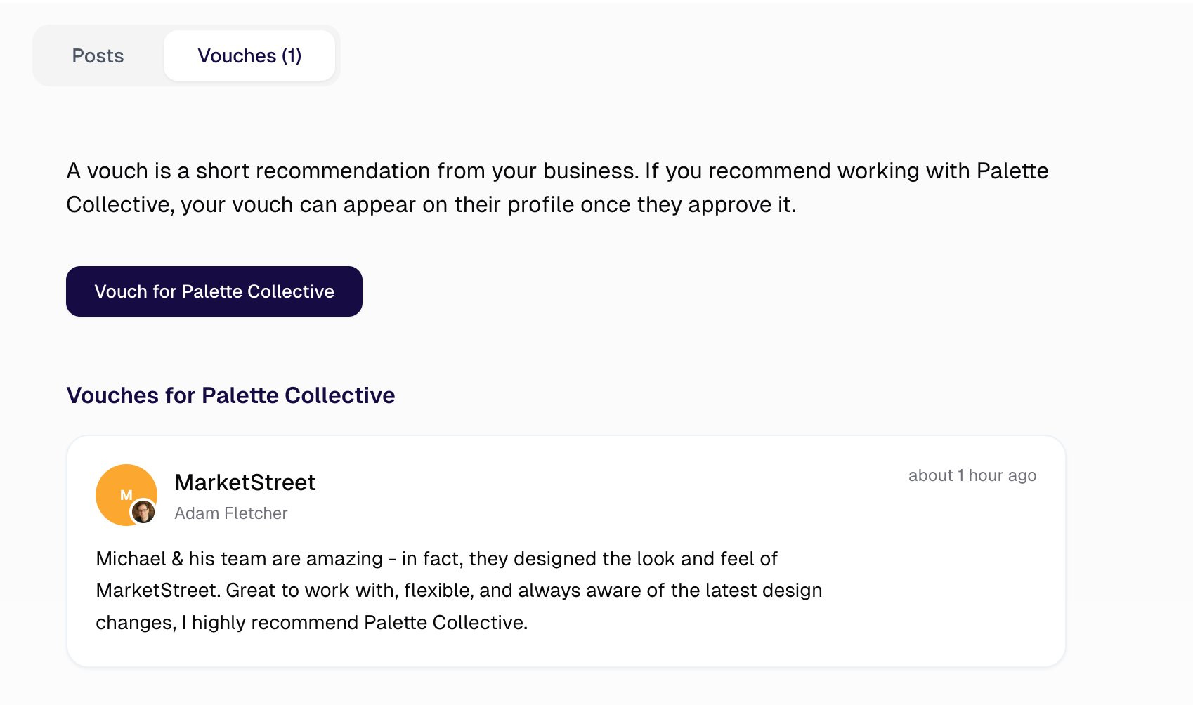Here’s what a vouch looks like in practice — this is one we gave to Palette Collective, the team behind MarketStreet’s design: