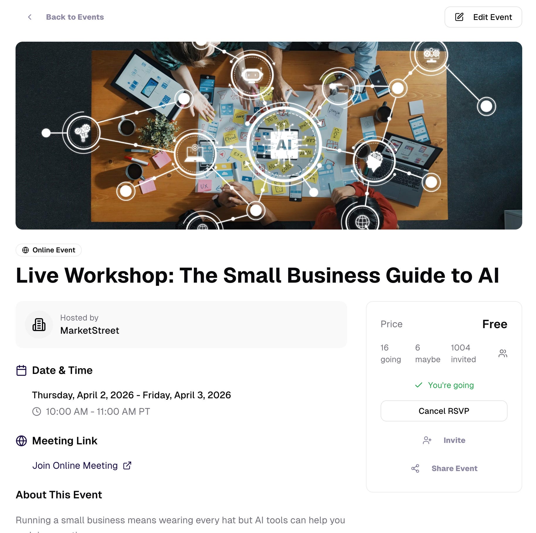 You can now create in-person or virtual events on MarketStreet and invite members from across the platform. Events can also live inside specific groups, so whether it’s a chamber meeting, an industry mixer, or a neighborhood pop-up — the right people will find it.