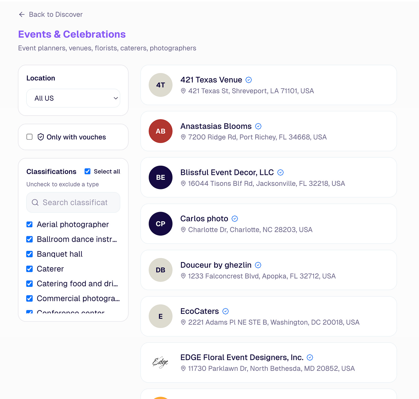 Every business on the platform is verified. The vouched ones come with a built-in recommendation from someone already in your network — so you’re not starting from zero when you reach out.