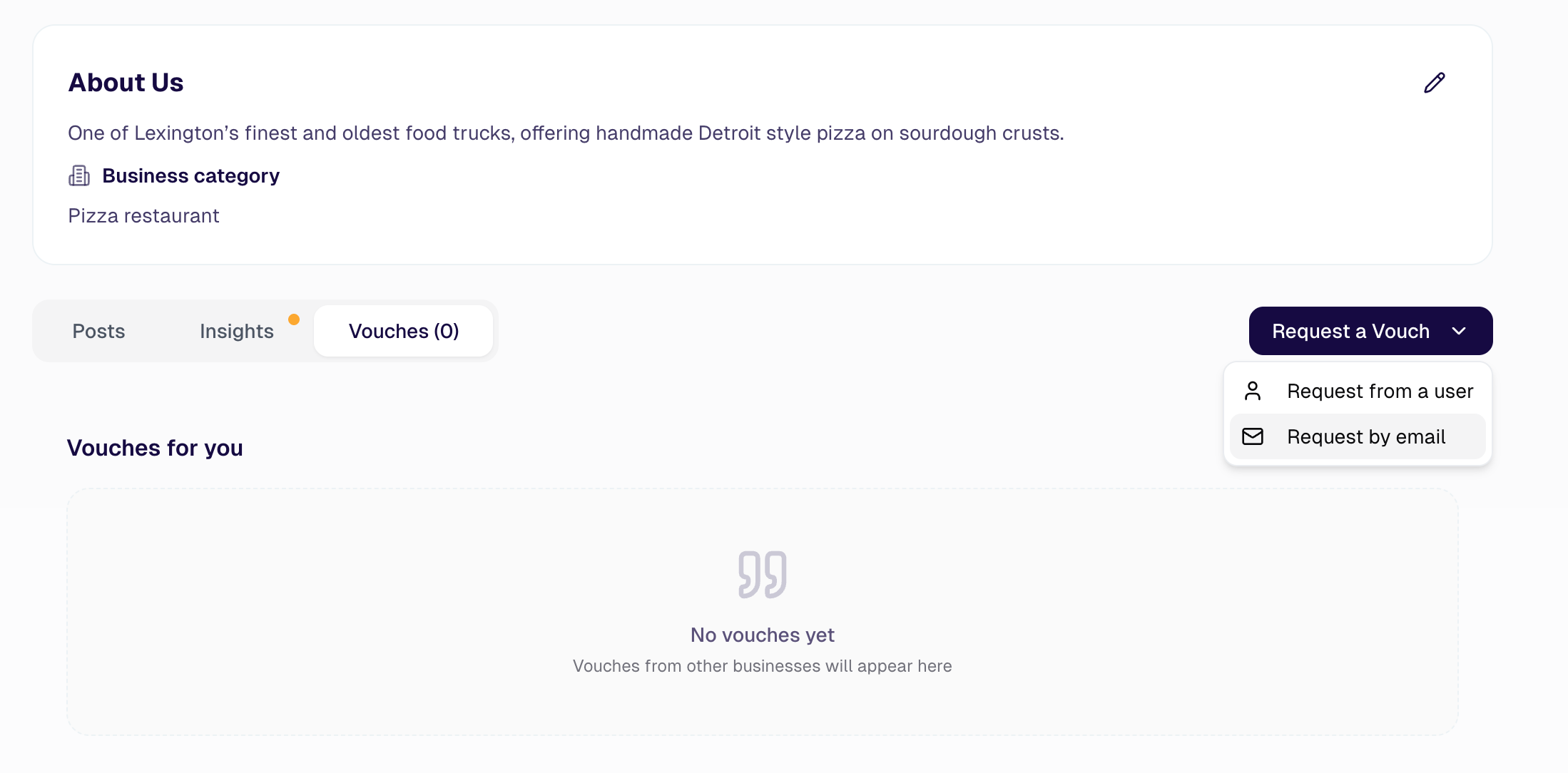 You can request a vouch from any business on the platform directly, or send a request by email — right from your profile page. And if you’ve worked with businesses you’d genuinely recommend, vouching for them takes 30 seconds and makes a real difference for them.